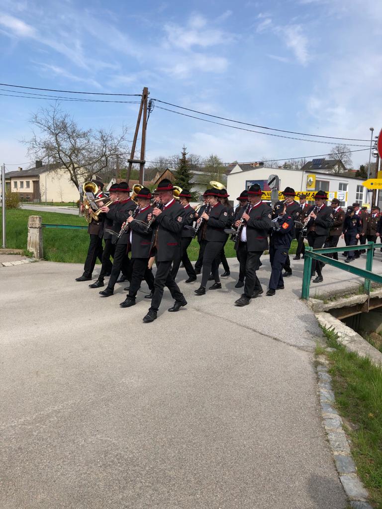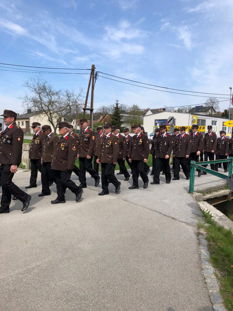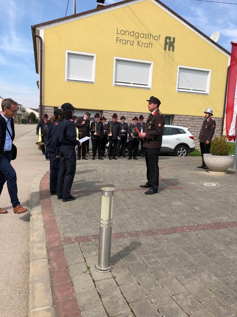 Nach dem Festakt wurde ins Vereinslokal, dem Gasthaus Flandorfer marschiert, hier wurde noch eine Gedenkminute für alle verstorbenen Mitglieder abgehalten und Florian und Günter Reschenauer zum Hauptfeuerwehrmann befördert. Danach gab es einen gemütlichen Ausklang mit Trinken und Essen und musikalischer Umrahmung durch die Ortsmusik.