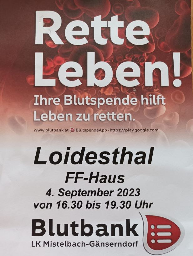 Am 04.09.2023 findet wieder ein Blutspenden im FF-Haus statt. Beginn 16:30 bis 19:30 Uhr.