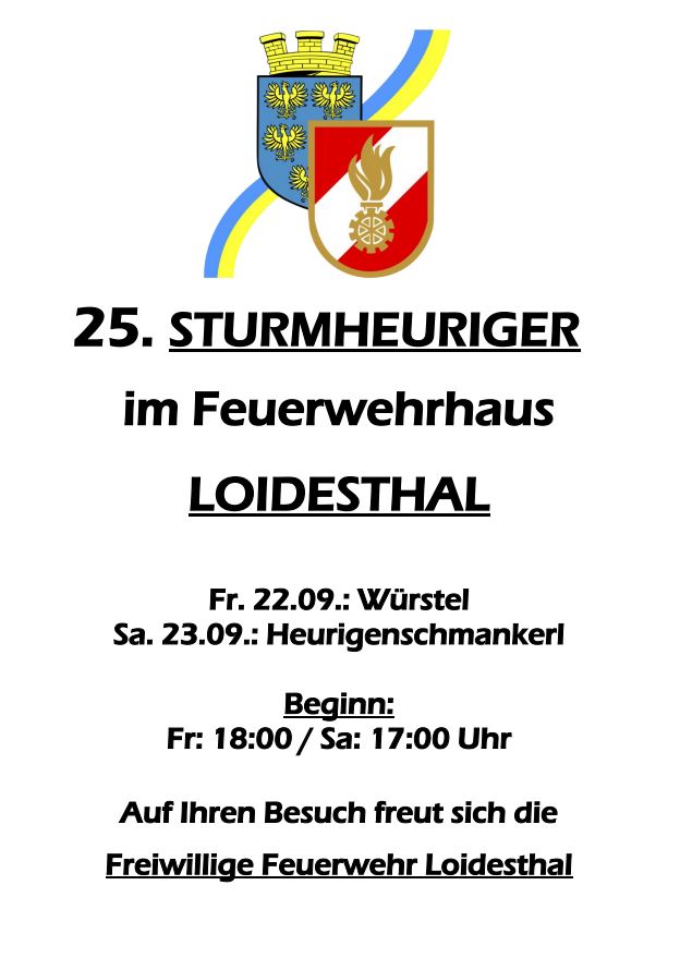 Deshalb lädt Sie die FF Loidesthal zum nun bereits 25. Mal zum Sturmheurigen ins Zeughaus ein. Um das Vierteljahrhundert gebührend zu feiern starten wir schon am Freitag (22.09.) um 18 Uhr. Am Samstag (23.09.) dürfen wir Sie bereits um 17 Uhr Willkommen heißen.