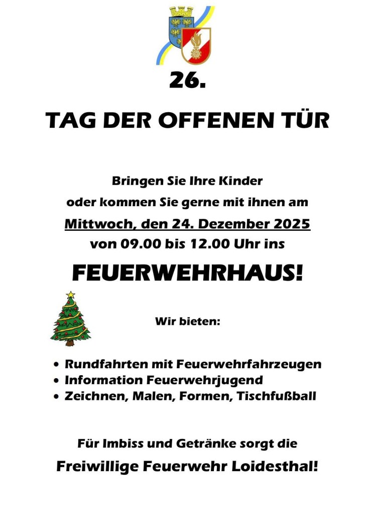 Am 24. 12. findet am Vormittag wieder der traditionelle Tag der offenen Tür im Feuerwehrhaus statt.