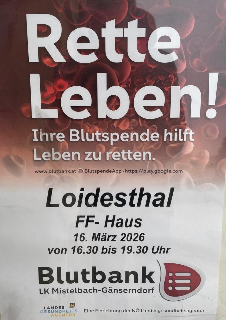 Am 16.03.2026 findet wieder ein Blutspenden im FF-Haus statt. Beginn 16:30 bis 19:30 Uhr.
